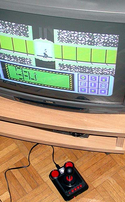 Der Joystick sieht so ähnlich aus wie der gute alte Competition Pro und kommt mit zwei Cinch-Anschlüssen: Einer für den Ton, einer für das Bild. Damit kann man den Joystick (batteriebetrieben) an jeden Fernseher anschließen und die 30 integrierten Commodore-64-Spiele spielen: Impossible Mission, Impossible Mission 2, Pitstop, Pitstop 2, Winter Games, Summer Games, Jumpman Junior, Gateway to Apshai und eben noch viele mehr.