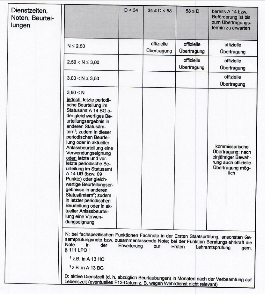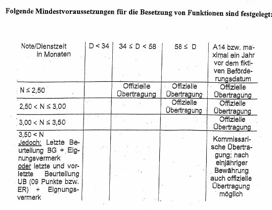 Ganz unbeliebt ist übrigens die Praxis, Funktionsstellen nur kommissarisch zu besetzen. Dann hat man die Arbeit, aber nicht die beförderungsrelevante Wertigkeit. Denn man muss – das ändert sich aber immer wieder mal – bestimmte Bedingungen erfüllen, um eine solche Stelle übernehmen zu dürfen. Zur Zeit sieht das so aus: