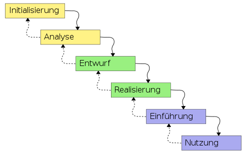 Je nach Ausformung besteht das Wasserfallmodell aus 5-7 Stufen (je nach genauer Ausformung des Modells), entlang derer die Entwicklungsarbeit läuft. Am Ende jeder Stufe steht ein greifbares Dokument oder Produkt, von dem aus es dann weiter zur nächsten Stufe geht. Stellt sich heraus, dass für die aktuelle Stufe keine befriedigende Lösung gefunden werden kann, geht man beim erweiterten Wasserfallmodell zur letzten Stufe zurück und versucht es da noch einmal – und notfalls kaskadenartig noch weiter zurück: