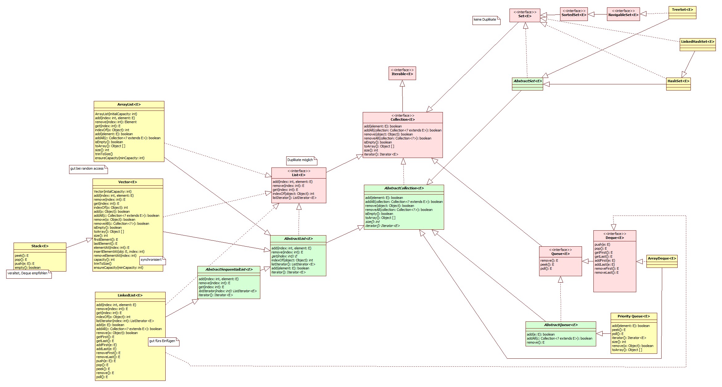Schön sieht man die Zusammenhänge zwischen Vererbung, Schnittstellen (rot) und abstrakten Klassen (grün). ArrayList, Vector und LinkedList erben manche Methoden von der abstrakten Oberklasse AbstractList (die wiederum von AbstractCollection erbt), angesprochen werden können die Listenklassen über die gemeinsame Schnittstelle List.