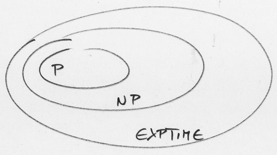 Daneben gibt es noch weitere Klassen, also zum Beispiel die Klasse EXPTIME. Da sind die Aufgaben drin, für die man mit höchstens exponentiellem Zeitaufwand eine Lösung finden kann. (Das schließt alle Aufgaben aus NP ein, und dann natürlich P sowieso. Aber dazu eben auch die Aufgaben, für die selbst das Überprüfen einer vorgeschlagenen Lösung sehr viel Arbeit macht.) Dazwischen und davor und dahinter und drumherum gibt es noch weitere Klassen, aber diese drei reichen uns hier. Ihr Verhältnis zueinander sieht man in diesem Diagramm: