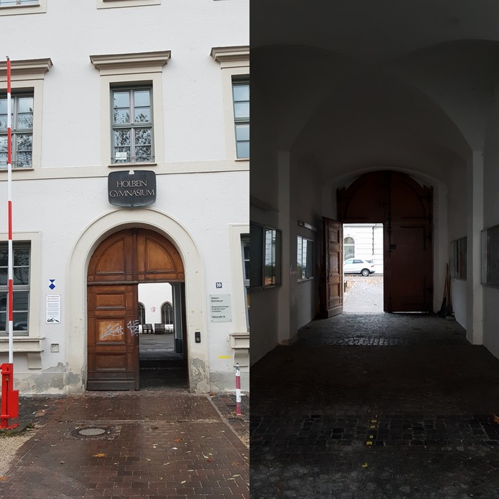 Links der Eingang von außen, rechts der Eingang von innen. Dazwischen hingen der Vertretungsplan und verschiedene Schaukästen. Das ist heute auch noch so, nur ohne Vertretungsplan, dafür mit einem sehr ausführlichen A-Z der Begriffe, für die die Schule steht und Konzepte, die sie vertritt. (Unter M wie Mebis stand nichts.) Nach dem Eingang dann der Innenhof: