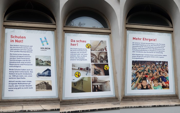 Jetzt kleben allerdings in den Fenstern des Neubaus Plakate, die den maroden Zustand der Schule und die schlechte Finanzierung durch die Stadt anprangern: