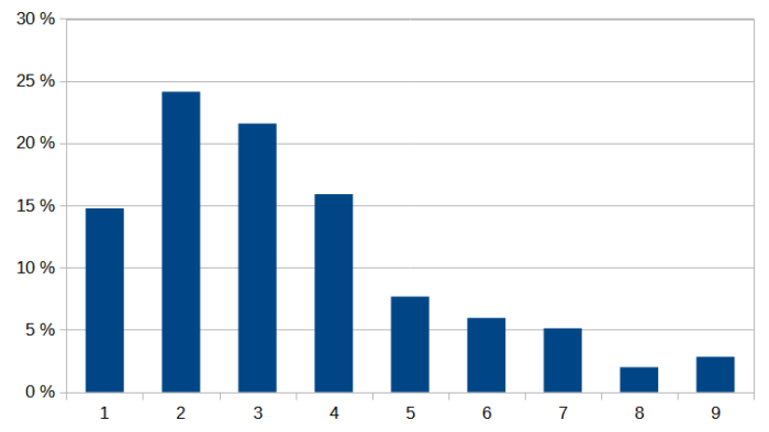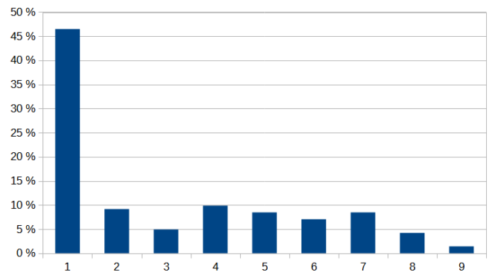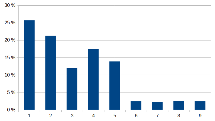 Und wenn man die Daten hat, kann man mit ihnen arbeiten – erst einmal Benfords Gesetz überprüfen; eine passende Tabellendokument-Vorlage hatte ich im Haus, weil ich das mal für die 9. Klasse vorbereitet hatte. Benfords Gesetz, das natürlich kein Gesetz ist, aber so heißt, besagt: In vielen natürlich entstandenen Datensätzen taucht als erste Ziffer der Zahlen die 1 viel häufiger als die 2 auf, und die 2 häufiger als die 3, und so weiter. Warum das so ist, ist nicht ganz klar, und es gilt auch nicht uneingeschränkt, aber dennoch ist der Unterschied zu reinen Zufallszahlen klar: Da erscheint jede Ziffer gleich oft am Anfang einer Zahl.