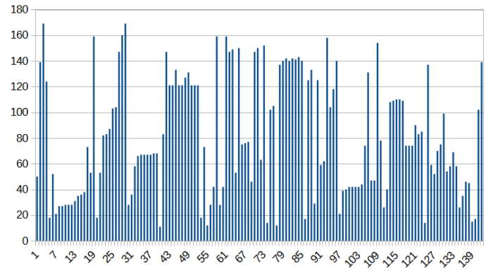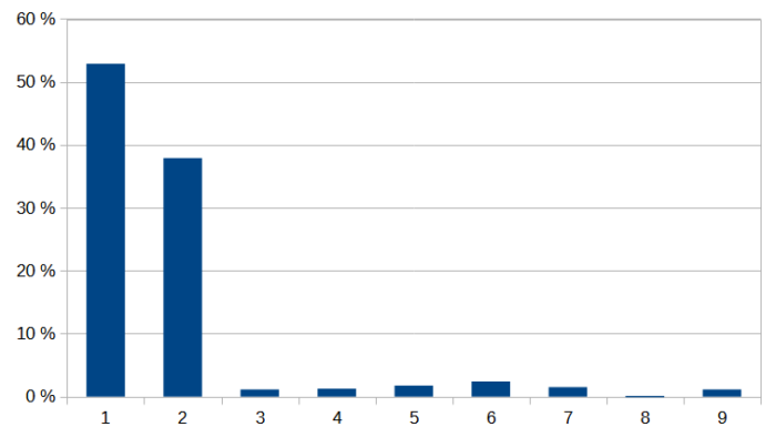 Das passt schon besser zu Benfords Gesetz, wenn auch nicht ideal – es liegt vielleicht auch ander Struktur des vewendeten Sachbuchs. Zum besseren Vergleich bräuchte ich das Register einer Biographie oder Autobiographie, aber so etwas hatte ich nicht digital da, und zum Einscannen und Texterfassen hatte ich so gar keine Lust.
