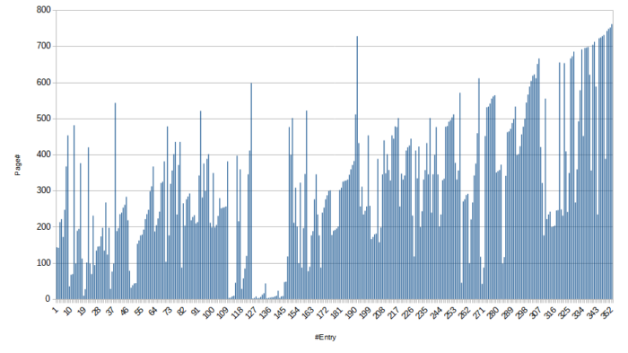 Man sieht als erstes eine Lücke in der Mitte. Das sind niedrige Seitenzahlen, die alphabetisch erst am Ende der ersten Hälfte kommen. Man sieht zweitens eine Art spitz nach rechts zulaufender Blöcke oder Türme: Diese Art der Spitze entsteht durch Stichwörte wie bei Gandhi oben, wo es mehrere Seitenzahlen zum gleichen Stichwort gibt; diese Seitenzahlen sind dann natürlich aufsteigend angeordnet. Man sieht aber auch allgemein eine aufsteigende Tendenz, fast eine Kurve: Der ersten Hälfte des Alphabets entsprechen niedrige Seitenzahlen, der zweiten Hälfte, insbesondere am Ende, hohe Seitenzahlen. Aber auch hier muss man wieder mit anderen, echten Registern vergleichen. Hier wieder die gleichen Vergleichsregister wie vorhin: