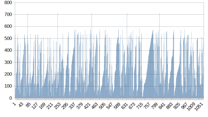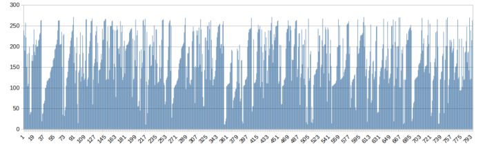Die üblichen schrägen Spitzen insbesondere ab Element 715 – und ich sag noch beim Abtippen zu Frau Rau: Der mochte Nietzsche schon besonders gern. Aber keine allgemeine Aufwärtstendenz, wie sie ja auch nicht zu erwarten wäre.