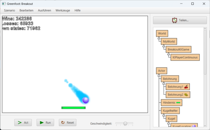 In Breakout prallt ein Ball von allen Wänden und dem Schläger ab; der Agent soll lernen, den Schläger so zu steuern, dass der Ball erreicht wird. Berührt der Schläger den Ball, zählt das als Sieg; berührt der Ball den Boden, zählt das als Niederlage. Man lässt den Agenten eine Zeitlang spielen und alles ausprobieren und eine Q-Tabelle anlegen.