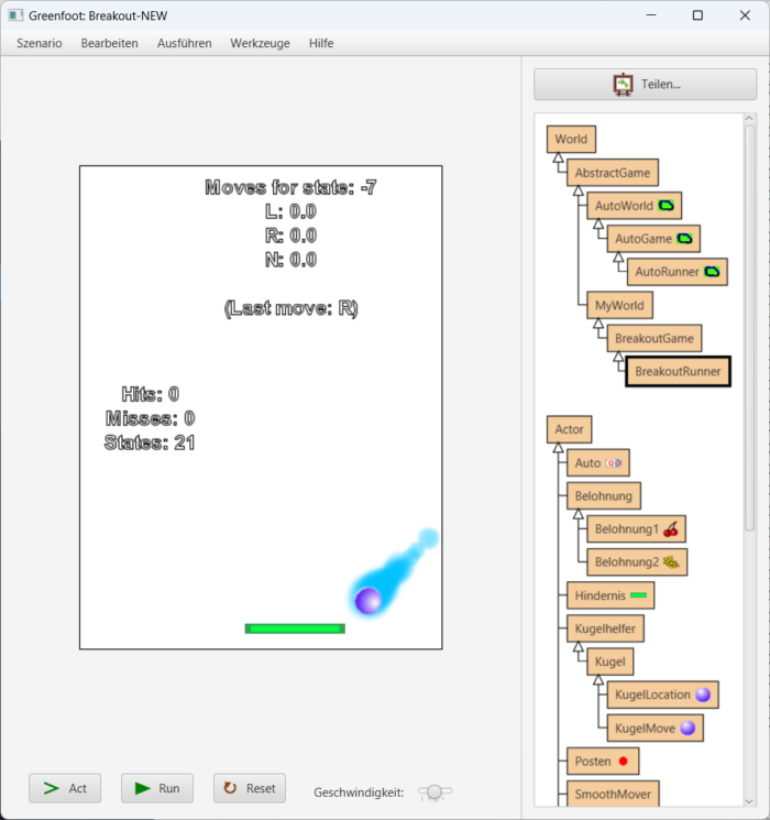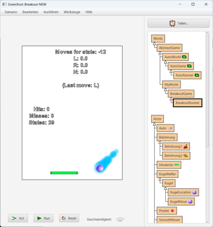 Die erste Frage, die man sich stellt: Welche Zustände sollen in die Q-Tabelle eingetragen werden? Relevant sind möglicherweise die x- und y-Position des Balls, die x-Position der Schlägers, die Geschwindigkeit des Balls (falls es da Unterschiede gibt) und sein Drehwinkel. Selbst wenn man großzügig rundet und das nicht pixelgenau misst, sonder gruppiert, landet man schnell bei 27000 Zuständen (experimentell herausgefunden bei den Dimensionen meines Spieles), die verwaltet werden wollen. Dazu aber mehr im nächsten Beitrag. Vorab: Wenn man schon weiß, welcher Faktor oder welche Faktoren wirklich relevant sind für die Lösung des Problem, kann man sich darauf beschränken. Und beim einfachen Breakout oben reicht die Differenz der x-Positionen von Kugel und Schläger. Alles andere ist vorerst egal. Dann gibt es je nach Spielfeldgröße und eventueller Pixel-Zusammenlegung nur ein paar Dutzend Zustände. – Die Anzahl der möglichen Entscheidung ist bei jedem Zustand ohnehin klein: Der Agent kann den Schläger nach links, nach rechts, oder gar nicht bewegen, abgekürzt L, R, N.