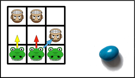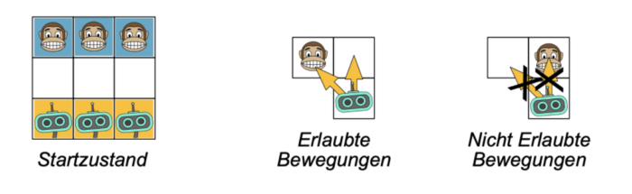 Das Spiel ist eine Art Mini-Schach auf einem 3×3-Spielfeld, mit drei Bauern auf jeder Seite. Oben die Affen der menschlichen Spielerin, unten die Roboter (oder, in anderen Fassungen, Krokodile) des KI-Agenten.