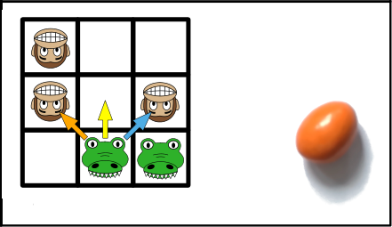 Die menschliche Spielerin 1 beginnt immer mit einem Zug der Affen. Der Agent ist immer Spieler 2, der mit den Robotern oder Krokodilen. Bei optimaler Strategie gewinnt Spieler 2 immer. Das ist am Anfang aber noch nicht offensichtlich, etwa wenn sich Schülerinnen und Schüler enaktiv als KI-Agent versuchen, dem Schokolinsen-Algorithmus folgend.
