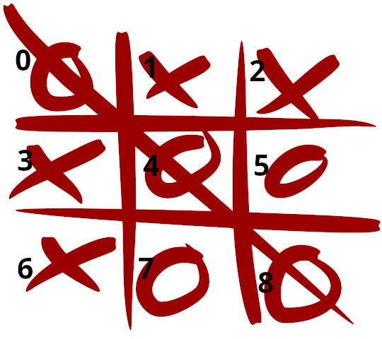 Die neun bespielbaren Kästchen habe ich wieder von 0 bis 8 durchnummeriert. Eine „1“ in einem Kästchen bedeutet Spielerin 1, eine „2“ Spieler 2, eine „0“, dass es leer ist. Die gezeichnete Situation oben sieht für den Rechner also eher so aus wie das hier: