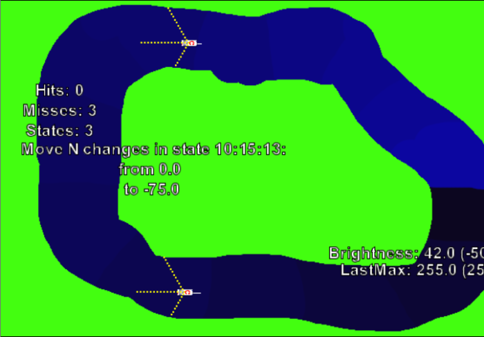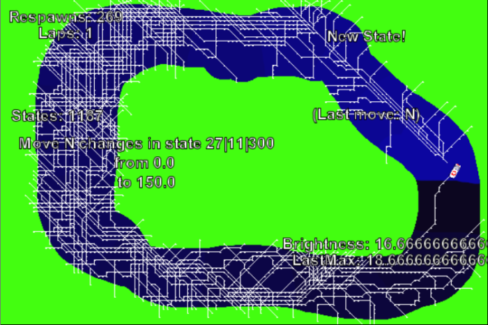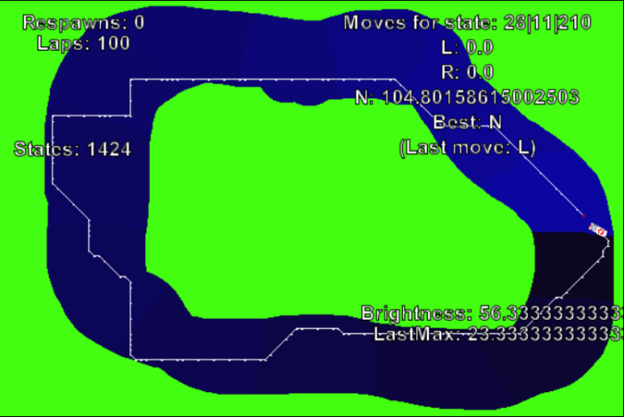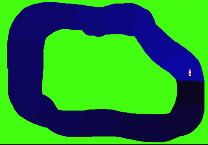 Zu (2): Die Belohnung ist schwieriger. Ich habe dazu die befahrbare Strecke in farblich markierte Abschnitte unterteilt. Die könnte man vor dem menschlichen Auge verbergen, aber ich lasse sie mal sichtbar. Ein Gewinn ist es für die KI immer, einen neuen, helleren Abschnitt aus einem dunkleren heraus zu erreichen; eine Niederlage, zu einem dunkleren zu wechseln. (Sonderregeln fürs Rundenende, weil da die Farben ja wieder von vorne losgehen.) Ins Grün zu geraten bringt auch Punktabzug. Sich im selben Abschnitt zu bewegen wird für den Anfang weder belohnt noch bestraft, es geht also nicht um Geschwindigkeit.
