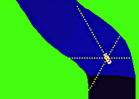 Ich habe das Auto mit einer variablen Anzahl von Sensoren ausgerüstet, die die Entfernung zum Grün messen, jeweils nach vorne und links und rechts oder hinten und so weiter. Der Zustand des Autos ist jetzt nicht mehr von der absoluten Position abhängig, sondern von der relativen Distanz zum Straßenrand.