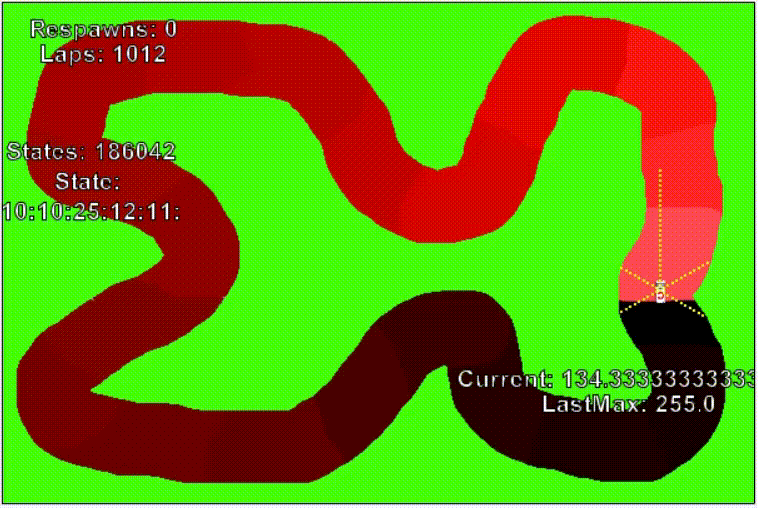 Bei 3 Sensoren und einer Reichweite von 25 sind das noch verkraftbare 15625 potentielle Zustände, bei 5 Sensoren knapp 10 Millionen. Praktisch komme ich bei der blauen Strecke aber nur auf 55000, auf der roten auf 200000. Und das funktioniert dann auch tatsächlich einigermaßen; hier als animiertes gif: