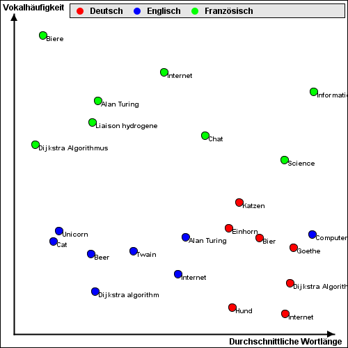 Die bereits bekannten, „gelabelten“ Datensätze sind als rote, grüne und blaue Punkte in einem Koordinatensystem eingetragen. Das Label ist jeweils Deutsch, Englisch oder Französisch. Jeder Datensatz besteht nur aus zwei Werten, zwei Dimensionen. Das ist praktisch und absichtlich, weil man das nur dann so schön in einem zweidimensionalen Koordinatensystem darstellen kann. Ursprung der Datensätze sind kurze Texte in englischer, französischer und deutscher Sprache; der Titel der Texte ist im Diagramm eingetragen. Der Datensatz selber enthält ja nur zwei Werte, nämlich durchschnittliche Wortlänge und durchschnittliche Vokalhäufigkeit. (Ich nehme an, damit sind die Buchstaben a, e, i, o, u gemeint; ob Umlaute dabei sind, weiß ich nicht; vokalisches y sicher nicht.)