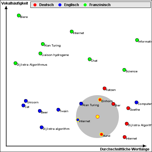 Hier ist die Nachbarschaft durch einen grauen Kreis markiert, die drei nächsten Nachbarn sind Einhorn (Deutsch), Hund (Deutsch) und Internet (Englisch). Die Mehrheit entscheidet, kNN weist dem neuen Text das Label „Deutsch“ zu, übrigens korrekt. Bei anderen Werten für k können andere Ergebnisse herauskommen.