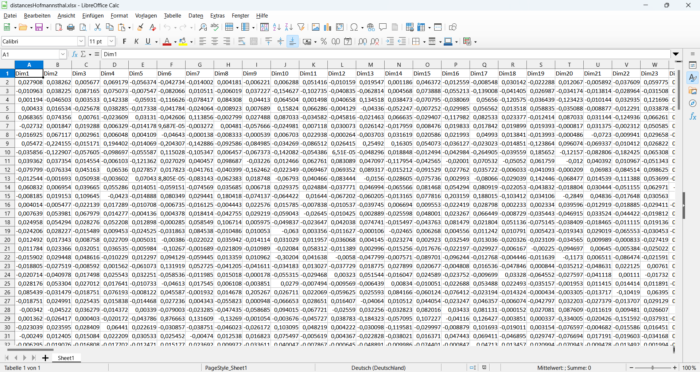 Das wäre eine schlimme Formel, wenn man sie von Hand eingeben müsste, aber es gibt glücklicherweise eine Tabellenkalkulationsfunktion, die genau das macht: SUMMEXMY2(Zeile1; Zeile2) berechnet die Summe der Quadrate der jeweiligen Differenzen, wovon man nur noch die Wurzel nehmen muss, schon hat man die euklidische Distanz in diesem 300-dimensionalen Raum.