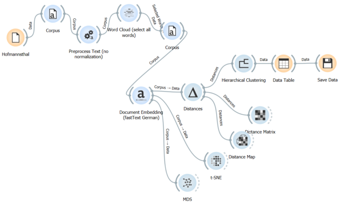 Weil das viel Aufwand ist, gibt es für fastText bereits trainierte Modelle für knapp 300 Sprachen, man muss also nicht mehr selber so ein Modell erstellen sondern kann eines verwenden, das bereits jemand anderes vorbereitet hat. Wer sich auskennt oder einarbeitet, kann sich diese Modelle herunterladen und damit arbeiten. Bei mir ist weder das eine noch das andere der Fall, aber ich arbeite gerne mit der KI-Suite Orange (Blogeintrag), und die hat alles Nötige bereits integriert. Ein herunterladbares Muster ist auf den Orange-Seiten unter „Semantic Word Map“ zu finden. Es hat ein bisschen gedauert, bis ich das für meine Zwecke umgewandelt habe. Hinweise zur Erinnerung für später: (1) Wenn man das System kopiert und umbaut, man muss einmalig in der WordCloud alle Wörter auswählen. (2) Der Lemmatizer hat Probleme mit Umlauten; ausschalten.