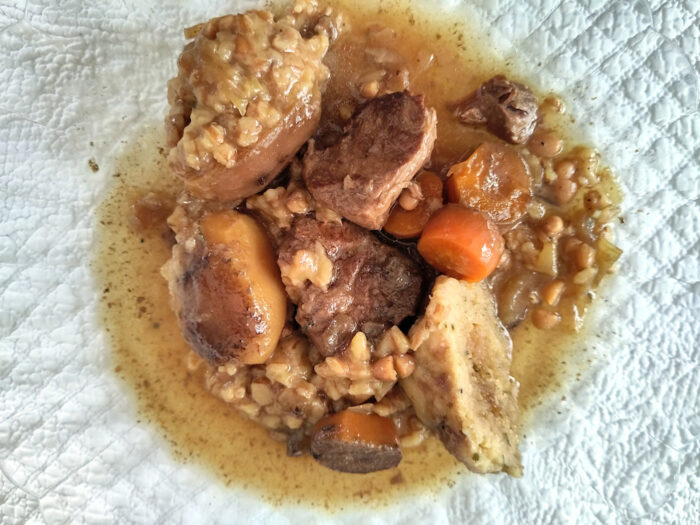 Über Nacht war ein Tscholent im Ofen gewesen, ein klassisches ostjüdisches Schabbatgericht mit sephardischen Wurzeln: separat werden Zwiebeln und Fleisch angebräunt, dann zusammen mit eingeweichten Bohnen, Graupen, Kartoffeln und in meinem Fall auch weniger kanonischen Karotten in einen Schmortopf geschichtet. Würzen mit Pfeffer, Salz, Thymian, Paprika; mit Wasser bedecken und zehn bis zwölf Stunden (oder mehr?) bei 100° im Ofen lassen. So konnte man am Schabbatmittag einen Eintopf essen, ohne ein Feuer anmachen zu müssen.