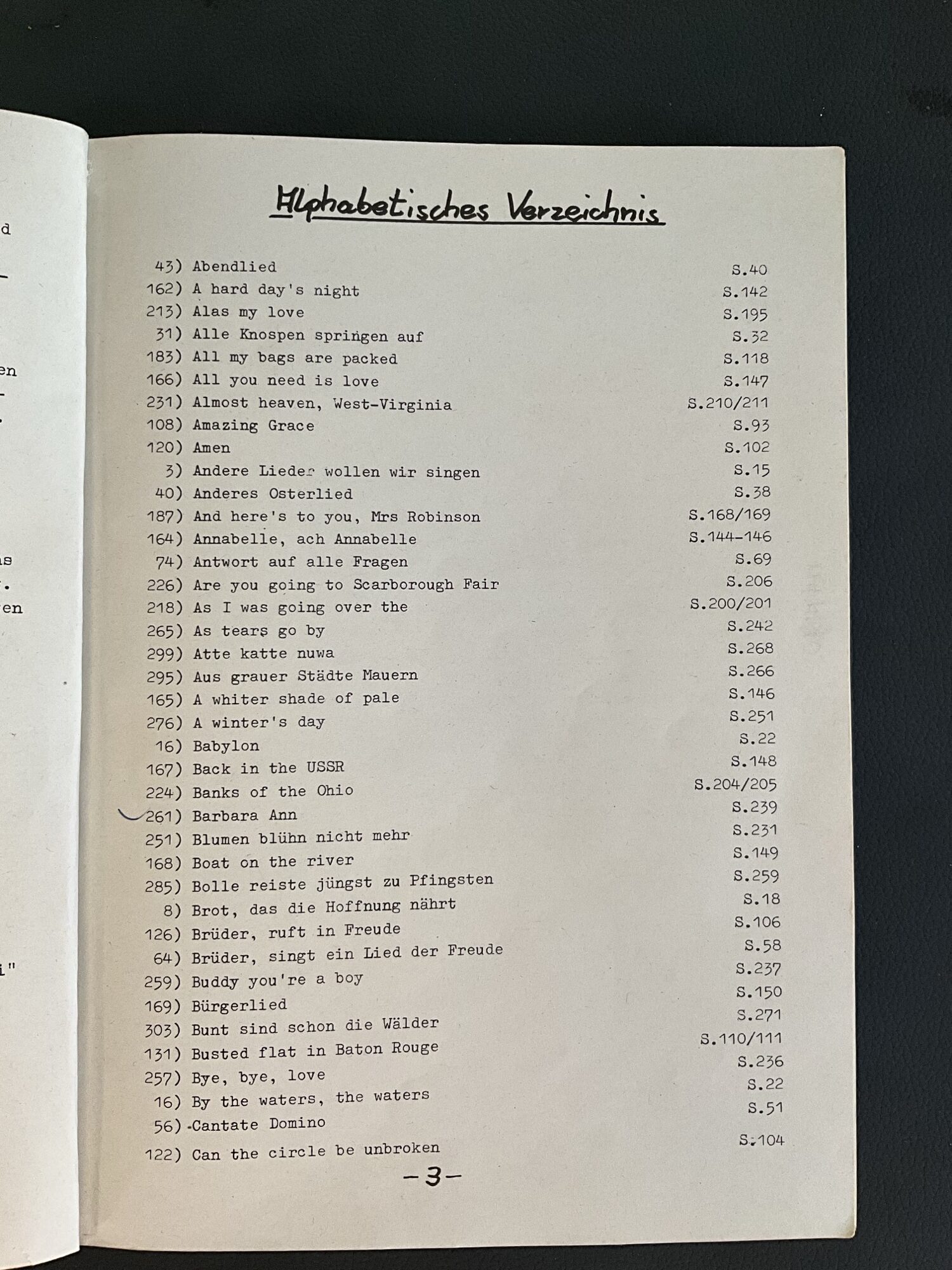 Das oben erwähnte Liederbuch hieß 303, vermutlich, weil 303 Lieder darin waren. Es musste aus der kirchlichen Jugendbewegung stammen, kam vielleicht über meinen Bruder in den Haushalt? Es gab Gospels drin und Traditionals, deutsche und irische Volkslieder, Beatles, wenig Woody Guthrie, mehr Pete Seeger, gesellschaftskritische Hits der 1960er Jahre. Nichts aus der musikalisch so reichen amerikanischen Depressionszeit, „Brother, Can You Spare A Dime“ etwa, das kannte damals keiner.