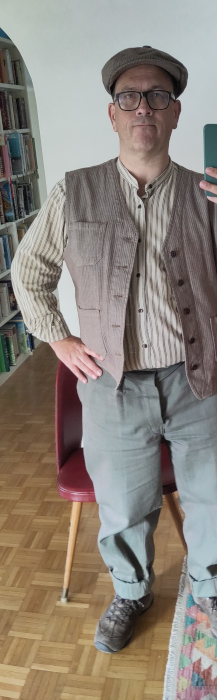 So wie rechts sah ich am Trachtentag aus. Eine Tracht habe ich nicht, dann wenigstens gute, ehrliche Arbeiterkleidung. Zumindest die Hose ist tatsächlich aus den 1950er Jahren, davon wurde ein Satz eingelagert gefunden, upcycling als schicke Mode. Der Rest, nicht so alt wie er tut.
