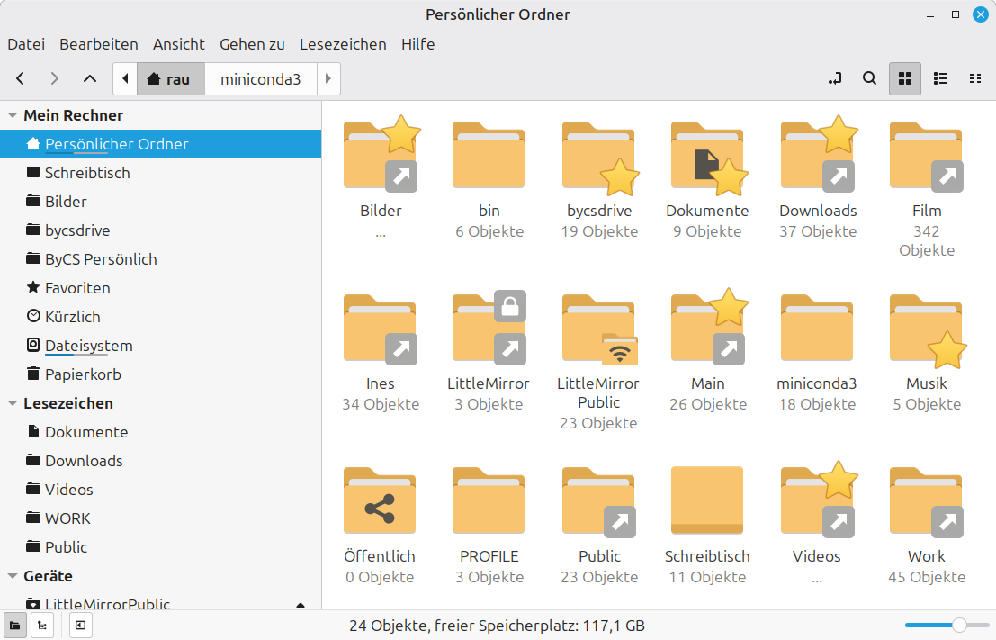 Das Bild zeigt einen Ausschnit aus dem Explorer, in einer von verschiedenen Ansichten. Die Icons mit den Pfeilen sind Verknüpfungen (Symlinks) auf den Inhalt anderer Verzeichnisse. Die befinden sich letztendlich auf derselben Festplatte/Partition, teilweise auf einer anderen, teilweise auf einem über das Netzwerk verbundenen Sevrer – das spielt auf dieser Ebene keine Rolle. Das Icon „LittleMirrorPublic“ mit dem Funksignal ist keine Verknüpfung, sondern als direkt verbundenes Netzlaufwerk erkennbar. Ich überlege noch, wie ich das am Ende haben möchte. (Die Sternchen und das Schloss-Symbol bedeuten auch etwas, ist hier nicht wichtig.)
