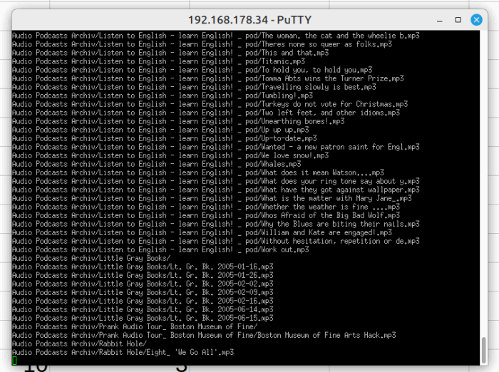 • Rhythmbox: Das lässt sich zwar – siehe oben – einfach installieren oder ist bereits vorinstalliert, aber wenn man von iTunes umziehen will, muss man doch etwas basteln. Erstens geht Rhythmbox standardmäßig davon aus, dass alle Musik in einem einzigen Verzeichnis (mit Unterverzeichnissen) liegt. Bei meiner bereits vorhandenen Sammlung ist das nicht so, und das will ich auch teilweise beibehalten, weil ich dann in Rhythmbox verschiedene Verzeichnisse einzeln auswählen kann. Dazu muss ich dconf-tools installieren und darin ein wenig herumschreiben, das ist aber ganz leicht: https://askubuntu.com/questions/189265/how-do-i-edit-the-list-of-music-library-locations-in-rhythmbox. Zweitens will ich vom bisher verwendeten iTunes umziehen: Bewertungen, Podcasts-Abonnements und Playlists. Für Podcasts ist mir Rhythmbox nicht geeignet. Playlists kann ich aus iTunes im .m3u-Format exportieren und in Rhythmbox importieren, allerdings hat sich der Speicherort bei den Liedern verändert, so dass ich da mit Suchen-Ersetzen im Texteditor anpassen muss. Es kursieren auch Python-Skripte, die das können, aber ich mache das lieber selber. Auch für Bewertungen (die ja standardmäßig nicht in den Datei-Metadaten gespeichert sind, sondern in der Musikdatenbank) gibt es Skripte, aber ich mache das lieber so: In iTunes nach Bewertung sortieren, die Anzahl der Sternchen in den Kommentar kopieren, und in Rhythmbox dann wieder andersherum zurück. Ich lerne daraus: In Zukunft nicht mit Bewertungen arbeiten, sondern möglichst mit Playlists, da sich die exportieren lassen. (Bewertungen werden häufig nicht in den Datei-Tags gespeichert.)