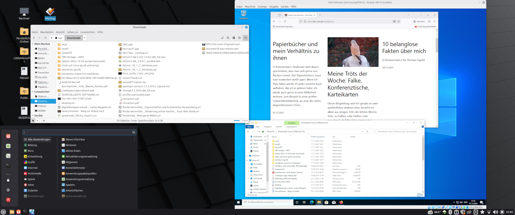 Außerdem habe ich ein virtuelles Windows 10 unter Linux eingerichtet, so wie ich früher ein virtuelles Linux unter Windows hatte. Das geht mit dem einfach zu installierenden Programm VirtualBox. Man braucht dazu nur eine .iso-Datei mit Windows 11 oder Windows 10 oder was auch immer; ich habe mich für Windows 10 entschieden, weil ich im Sommer für €4,30 zwei Lizenzschlüssel dafür gekauft habe. Vermutlich ginge das auch mit meinem Windows 11; ich weiß nicht, wie das mit den Lizenzen funktioniert, ob ich quasi einen neuen Rechner anmelden kann und meinen alten abmelden – wahrscheinlich macht Microsoft das so unmöglich wie möglich.