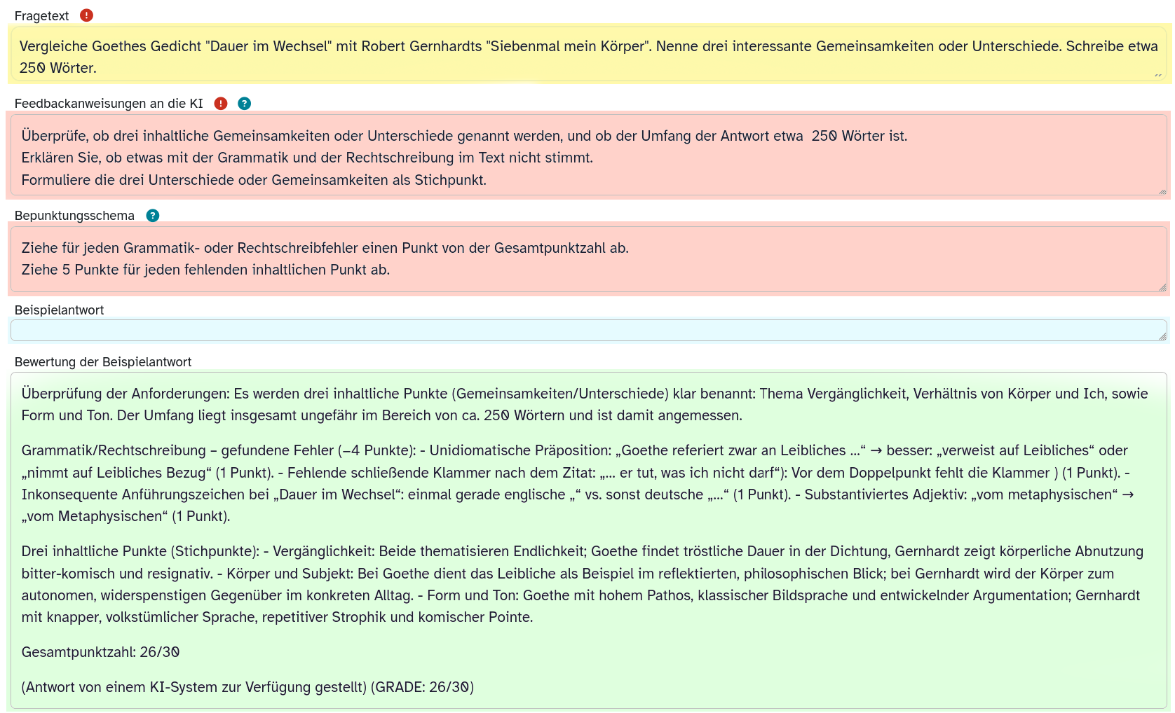 Jetzt könnte sich das ändern: Es gibt den Fragentyp Freitext mit KI-Feedback. Man gibt eine Frage für Die Schüler und Schülerinnen ein (im Bild gelb), man gibt Feedbackanweisungen und optional Bewertungskriterien als Prompt, und wenn dann jemand die Frage beantwortet, wird sie von der KI bewertet und vor allem kommentiert (blau):