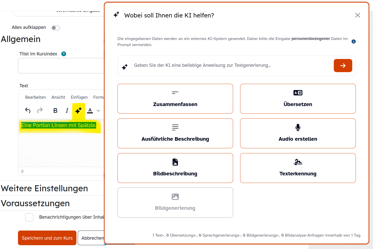 Überall, wo ein Texteditor da ist, kann man mit einem Klick auf die Zauberfünklein die KI beschwören, die dann Texte zusammenfasst, übersetzt, ausführlich, erklärt, eine Audiodatei daraust erzeugt, oder auch ein Bild beschreibt oder erzeugt. Die Schul-Administration schaltet einzelne Features für Lehrkräfte und potentiell Schüler:innen frei, die konkreten Lehrkräfte schalten diese dann verfügbaren Features in ihren Kursen den SuS zu oder nicht.