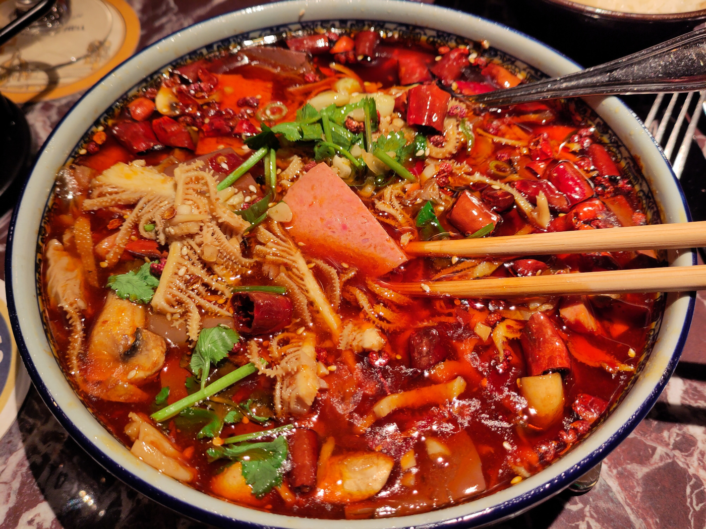 Etwas viel, auch wenn man die aromatische scharfe Brühe nicht mitisst. Mit: Entenblut (sieht man ganz unten im Bild, so eine gestockt-gelierte Scheibe) und Kutteln, Spam, Schweinemagen, Naturdarm, Bohnensprossen und Gemüse. Wie gesagt, sehr gut. Da essen wir noch mehr.