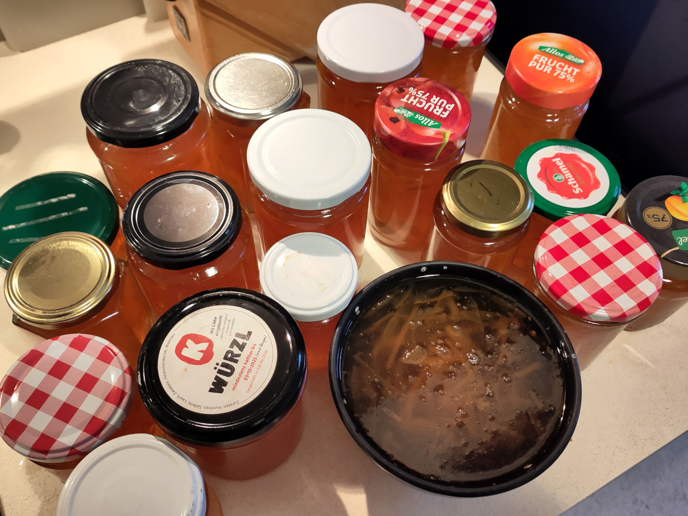 Als der Mülleimer nicht voller werden wollte, fiel mir auf, dass die Schalen der auszupressenden Bitterorangen ja gar nicht weggeworfen wurden, sondern einen wichtigen Teil der Marmelade ausmachten.