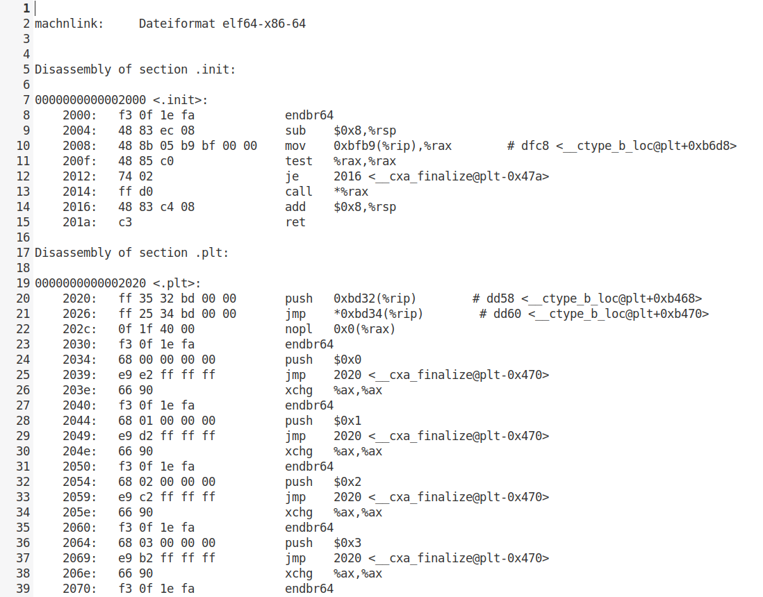 Einen ersten Einblick kriegt man mit dem Aufruf von objdump -d machnlink, hier wieder nur der Anfang: